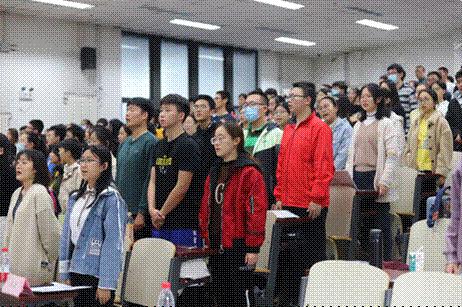 在主持人的带领下,同学们全体起立集体合唱《中国共青团团歌》。合唱完毕后,同学们就座等待着大会的开始。