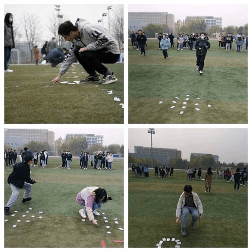 第一轮,扑克牌按照“四四五“的方式摆成了较为简单好记的形式。比赛开始后:有的同学在奔跑的过程中比划着翻到的纸牌数字,有的同学负责拿出了纸和笔记录不同点位扑克牌的数字,有的同学则负责在后方统筹秩序……很快就按照顺序翻了很多扑克牌。然而也有的小组迟迟未能进入状态,进度缓慢。经过了第一轮的比赛环节,同学们对规则更熟悉,相互之间磨合得更加默契。