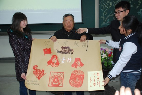 11月30日晚,乔安山老先生专程来到沙河校区,他结合自己的亲身经历,声情并茂的讲诉了自己与雷锋一同工作的点点滴滴,传达了雷锋精神的精髓——大爱精神。他从雷锋的青年时期讲起,讲了雷锋在鞍钢厂的杰出工作,当兵后的尽心为人民服务,还谈到了雷锋的各种趣事,以及他牺牲时的情境。老先生的语言朴实素朴,但语调坚定浑厚,字里行间透露出他为传承雷锋精神的决心。“雷锋是一位热心活跃的青年,他乐于助人,待人真诚并且不怕苦。他在部队里为战士们宣讲社会主义精神,竭尽自己所能去帮助他人,赢得了全国人民的尊敬”;“他的经济情况十分简朴,自己的收入也都用来为人民服务”。乔安山老先生说雷锋的这种精神源于他对所有人的爱。“雷锋有一颗感恩的心,他把其他城市都当做自己的家,把其他人都当做自己的亲人,真心为他们付出、服务,而这正是雷锋精神的精髓所在。”乔安山老先生时而风趣时而严肃的讲述让同学们认识了一个真实的雷锋,也感受到雷锋精神其实并不空洞和遥远。现场还播放了电影《离开雷锋的日子》片段,片段内容主要体现了乔安山老先生热心助人不计回报的精神。老先生在回答与雷锋共同生活的感受时,说自己从雷锋身上学到了奉献精神,并要坚持将这种精神传递下去。除此之外,老先生更是表达了对当代老员工的期望,希望他们能将雷锋精神传承下去,怀有一种大爱精神,像雷锋一样做人、做事,拥有美丽的心灵,以此建设美丽的国家。随后,同学们为老先生赠送了同学们亲手制作的精美雷锋剪纸。