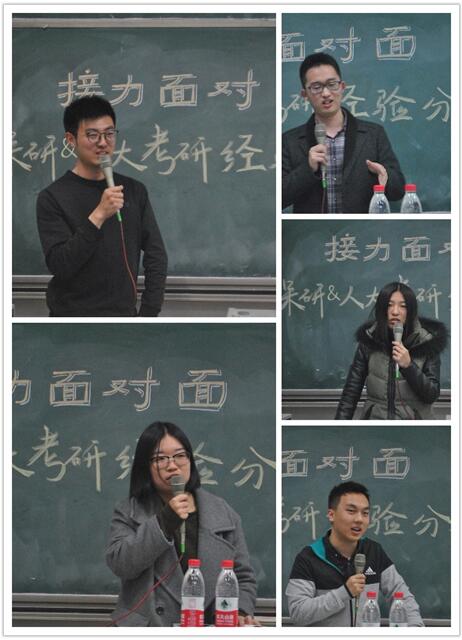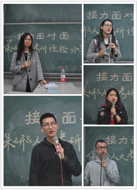 为激励引导同学们实现保研考研目标,继承BETVICTOR接力面对面优良传统, 3月18日18:30,BETVICTOR今年保研以及人大考研成功的13级学长学姐,于沙河校区东区主教106举办“接力面对面系列讲座——保研&人大考研经验分享会”。