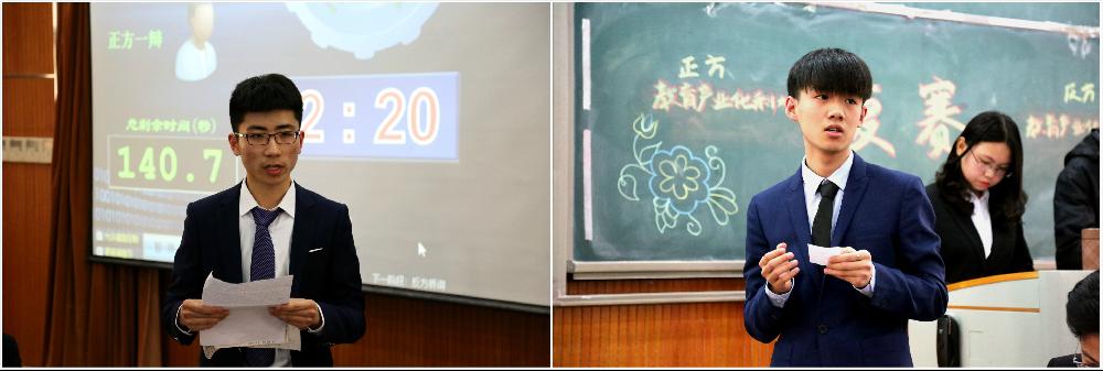 第二场比赛在15:40准时开始,比赛围绕当下热点“教育产业化”展开,论题为“教育产业化的利与弊”,正方是金融17-3的“牛牛大队”,反方则是来自互金15-1、国金15-1/15-2的“悖论队”。正方首先发言,从竞争机制促进教育资源优化,产业化促进教育普及面加大等方面着手并展开论证,反方则从学历贬值,教育的公益属性等方面对教育产业化提出质疑,正反双方的论证环环相扣,例证充实,使人信服。最终反方“悖论队”夺得了本次比赛的胜利,而最佳辩手则是正方的陆晓波同学。