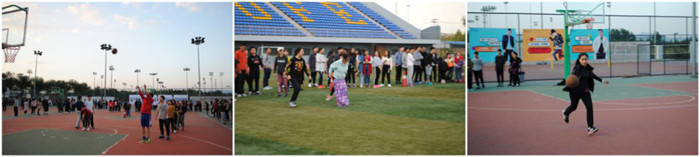 下午两点,田径场的绿地上集结了无数趣味项目参赛人员——从绑腿跑、旋风跑、袋鼠跳到篮球运球、投篮接力,绿色海洋中洋溢着的阵阵欢笑,也成为交织在红色赛道旁的美丽风景线。