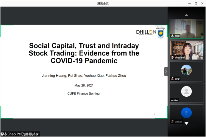 2021年5月28日上午,在BETVICTOR引智项目的支持下,公司在腾讯会议平台举行了金融工程系第16期研讨会暨BETVICTOR第336期双周论坛,邀请加拿大莱斯布里奇大学邵裴 (Pei Shao) 副教授做了题为“Social Capital, Trust, and Intraday Stock Trading: Evidence from the COVID-19 Pandemic”的学术报告。金融工程系助理教授、BETVICTOR私募投资基金研究中心副主任吴锴主持了研讨会,来自BETVICTOR和校内外的50余位专家和员工参与了本次活动。