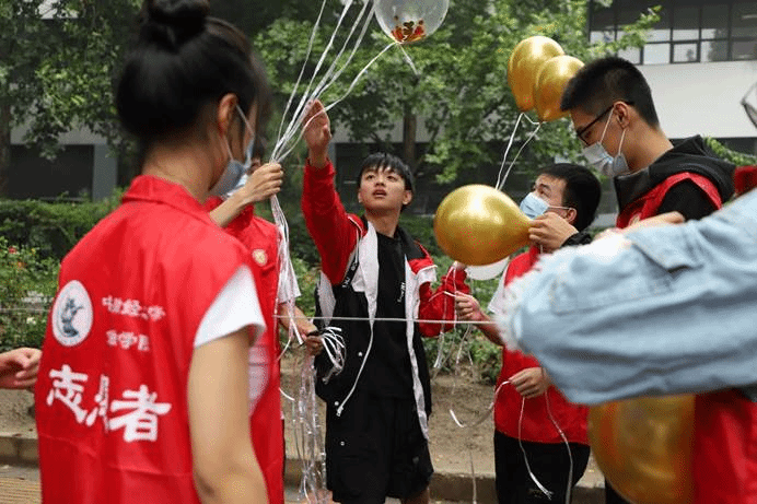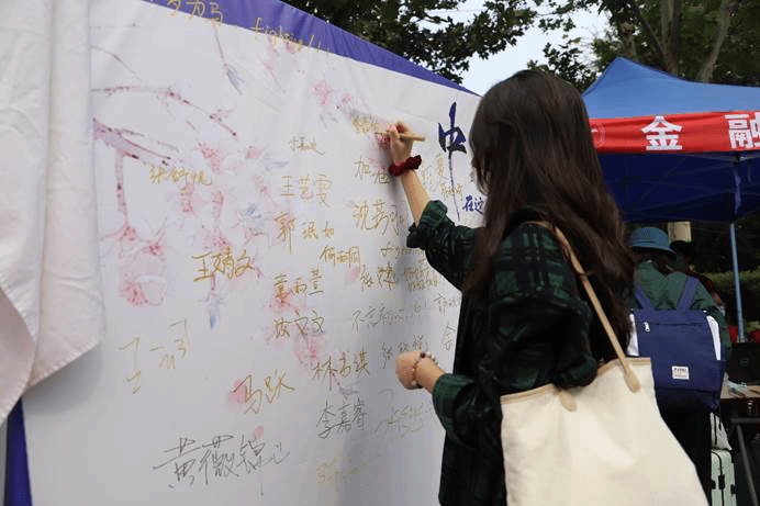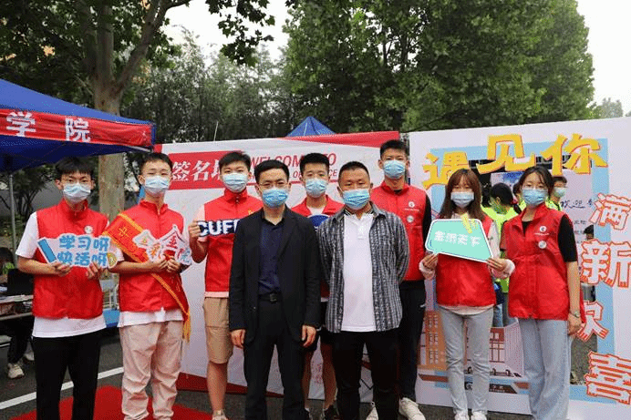 作为中财大院,金院的报道点也有许多亮点:象征着金彩金院的白金金属气球装饰着迎新棚,志愿者可以手持的青春标语KT板,新生可以寄语留念的祝福墙,以及带有公司标识的合照板,处处精心的布置彰显了公司对新生的美好期许。