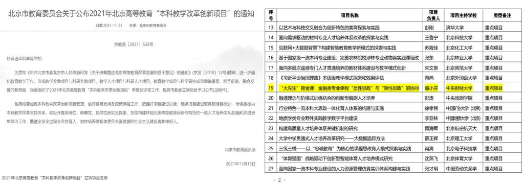 11月,国家教材委员会发布通知,公司李健教授担任主编的《中国金融学》入选首批中国经济学教材系列名单,该教材将直接进入“马工程”教材系列;9月,北京市教委公布2021年优秀本科教材课件项目名单,李建军教授和彭俞超副教授主编的《金融科技学》获批北京高校优质本科教材重点项目;7月,谭小芬教授主编的《金融学前沿文献导读》荣获第九届金融图书“金羊奖”。