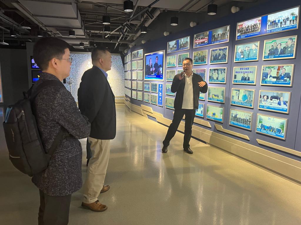 在奇安信科技集团有限公司,张学勇经理一行首先参观了公司展厅,随后与奇安信科技集团有限公司银行军团总经理徐懿巍进行了座谈交流,双方商定,依托即将签署的战略合作协议,双方未来将在合作共建金融网络安全实验室、联合开展金融网络安全课题研究及联合进行金融网络安全相关领域的人才培养进行深入的落地合作。中国电子集团战略合作部金融部北方区域总监刘璇参加了座谈。