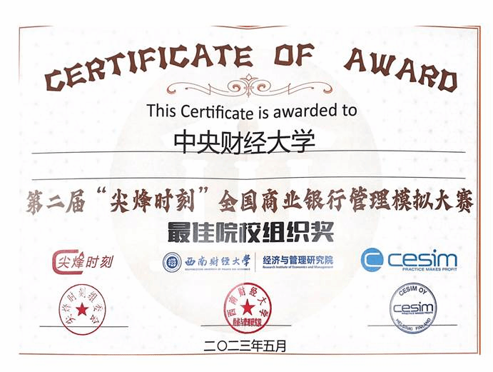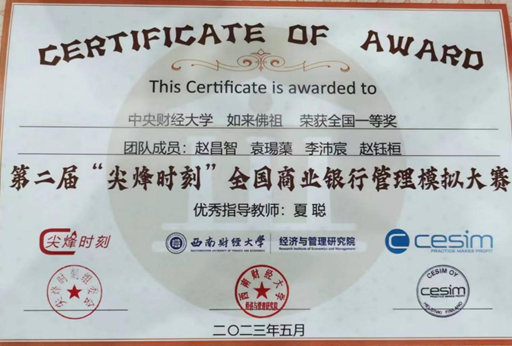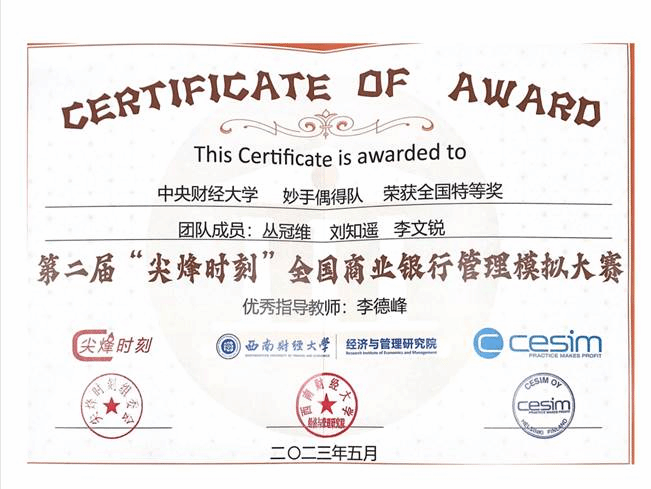 2023年5月21日,在成都西南财经大学举行的第二届“尖烽时刻”全国商业银行管理模拟大赛总决赛圆满结束。作为首次参赛院校,公司李德峰老师与夏聪老师指导的2个本科生团队经过激励角逐在总决赛上取得优异成绩:丛冠维、刘知遥组建的“妙手偶得”队在全国20个决赛队伍中拔得头筹,荣获唯一特等奖;赵昌智、袁瑒蕖、李沛宸、赵钰桓组建的“如来佛祖”队荣获一等奖。同时,同时,李德峰和夏聪老师荣获优秀指导教师,BETVICTOR荣获最佳院校组织奖。