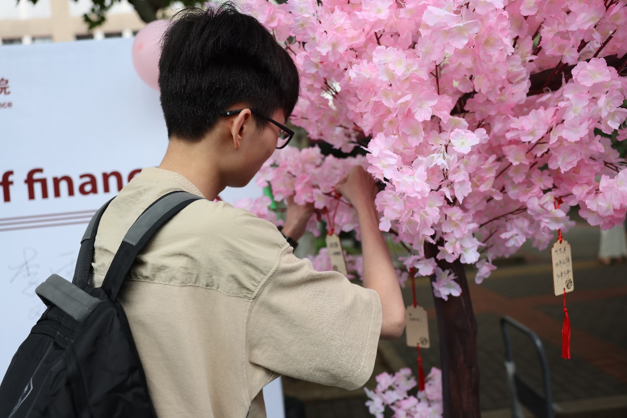 许愿树上悬挂着写有新生愿望的小木牌,公司希望四年后同学们所有的愿望和期许都能实现。