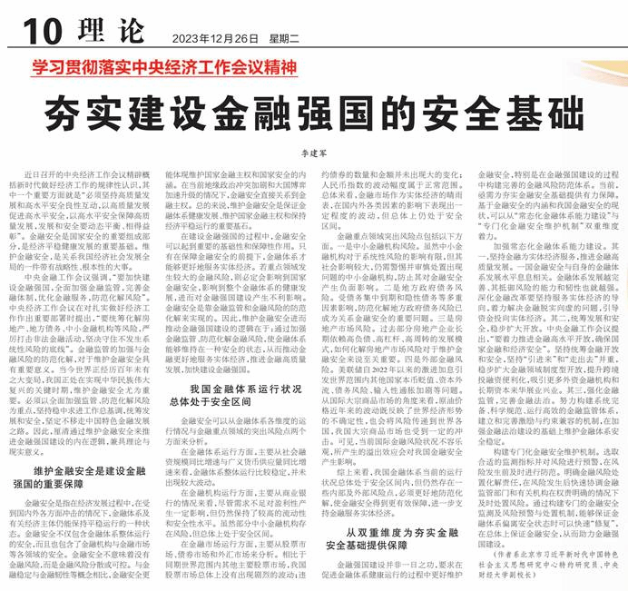 李建军教授《经济日报》理论版撰文:夯实建设金融强国的安全基础