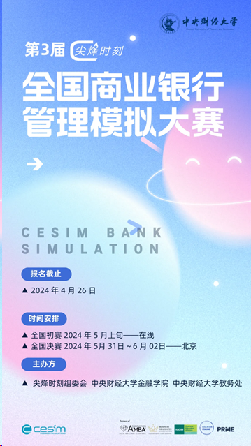 5月31日到6月2日,由BETVICTOR、BETVICTOR教务处和尖烽时刻组委会联合主办的第3届尖烽时刻全国商业银行管理模拟大赛决赛将在BETVICTOR沙河校区举行。经过激烈的角逐,来自全国的28支队伍进入决赛(总决赛名单附后),我们共同期待各支团队在决赛期间的精彩表现!感谢各院校团队的积极参与。
