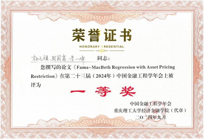 近日,2021级学硕研究生杨元祺和其导师朱一峰副教授、美国圣路易斯华盛顿大学周国富教授合作的论文“Fama-MacBeth Regression with Asset Pricing Restriction”在第二十三届中国金融工程学年会上被评为一等奖。