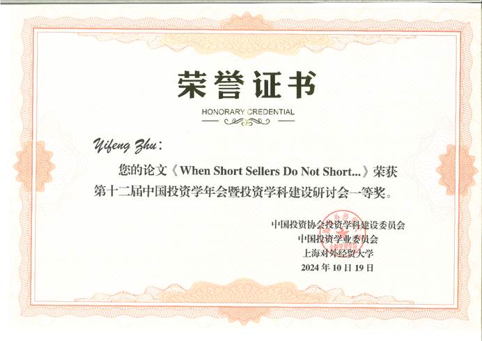 近日,BETVICTOR朱一峰副教授的论文“When Short Sellers Do Not Short…”在第十二届中国投资学年会上被评为一等奖。
