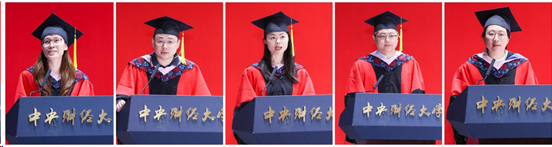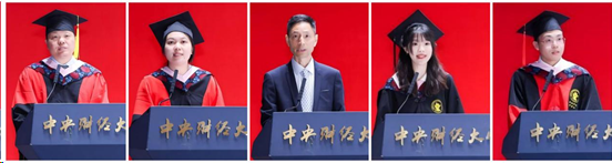 2021级金融学专业本科生林予淳、2022级金融学硕博连读生李梦如,分别代表本科和研究生毕业生发言。两位毕业生代表均回顾了珍贵的“中财金院记忆”,向公司表达了感恩与感谢,表示今后将带着在中财校园里获得的宝贵的财富,带着母校赋予的格局与视野,传承发扬中财龙马精神,勇敢去追逐自己的梦想,服务于人民福祉与社会进步,绽放属于金院人的光芒。