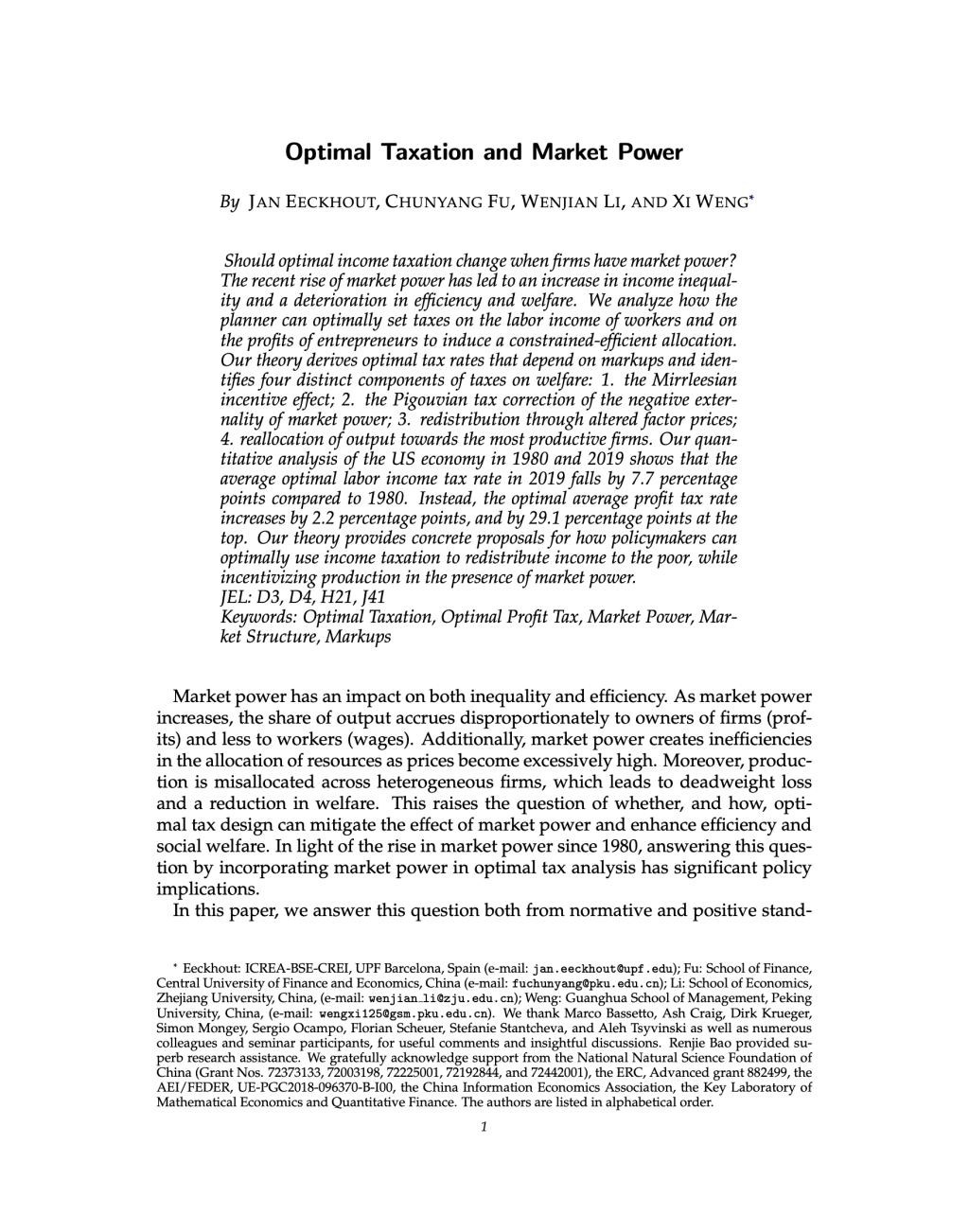 公司傅春杨副教授与西班牙庞培法布拉大学Eeckhout教授、浙江大学李文健教授、北京大学翁翕教授合作撰写的论文“Optimal Taxation and Market Power”在经济学五大顶刊之一The American Economic Review接收并在线发表。论文作者按音序排列。论文在线链接:https://www.aeaweb.org/articles?id=10.1257/aer.20211445。