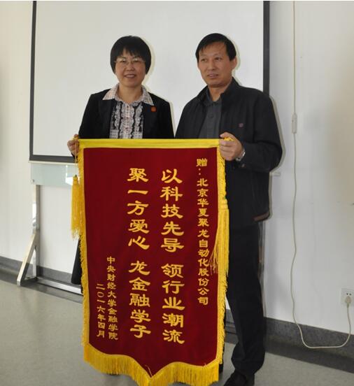 为了表达对北京华夏聚龙自动化股份公司关心和支持公司教育事业的感谢,葛仁霞书记代表公司向北京华夏聚龙自动化股份公司总经理张建军先生赠送了镌有“以科技先导 领行业潮流 聚一方爱心 龙金融学子”字样的锦旗。