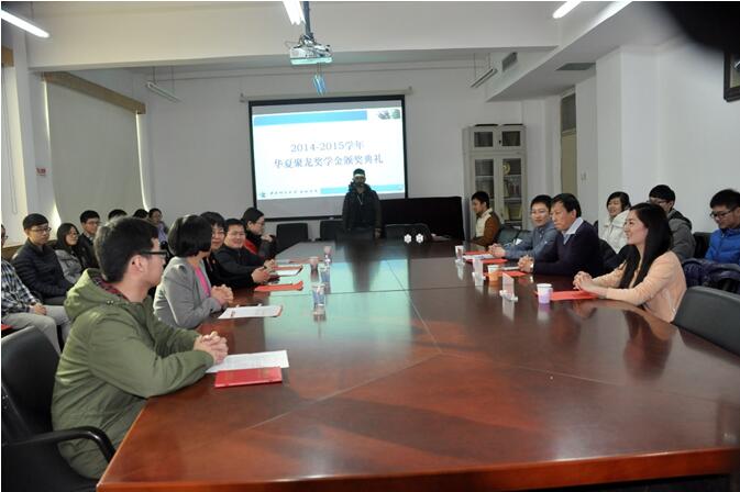 接下来,谭小芬副书记宣读《关于颁发2014-2015学年华夏聚龙奖学金的通知》,张建军总经理、葛仁霞书记共同为获奖员工颁奖并合影留念。