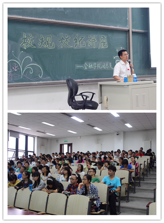 9月15日下午3点在主教109,保卫处副处长董盘齐以专题讲座的形式为新生进行了安全教育、心理教育以及校规校纪教育。保卫处副处长董盘齐在讲座中强调了安全和健康是基础。他提到了宿舍安全、交通安全和治安防范,反复提醒员工提高安全意识。随后他着重强调了心理健康问题,指出员工在角色转换与环境适应上可能遇到挫折,并介绍了公司公司全员全方位心理健康教育体系,提醒同学们处理好宿舍关系,班级关系等。保卫处副处长董盘齐就校规校纪问题着重强调大学考试中坚决抵制作弊行为,以及作弊行为带来的终身无法弥补的后果。深刻的道理、朴实的话语,结合丰富生动的实际案例,让同学们在轻松的氛围中受到了良好的教育。