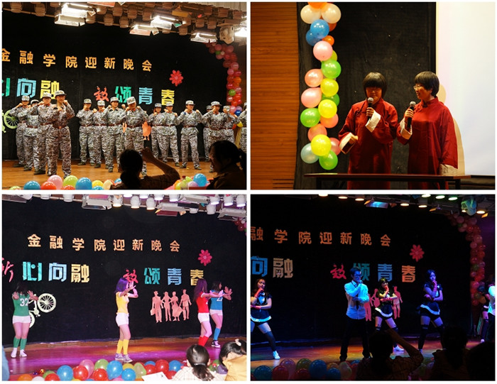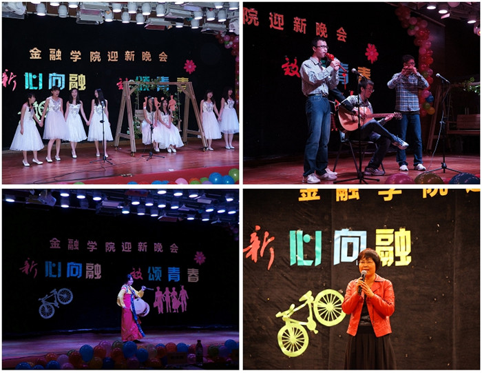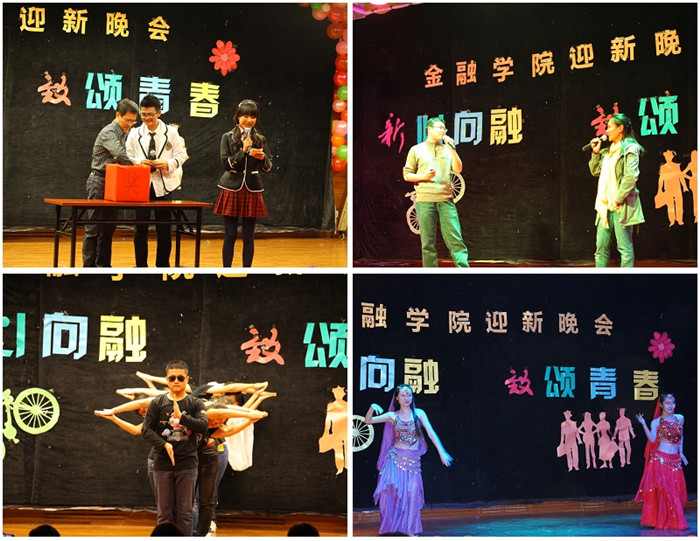 伴随着长鼓舞铿锵的鼓点与青花瓷乐器合奏典雅的旋律,迎新晚会在一段清新唯美的视频中拉开了序幕。晚会开场,文艺部女生身着白裙,表演精心准备的小合唱《故事里的树》,歌声婉转,将在场的同学们带入故事里。合唱结束,主持人随即登台宣布了本次迎新晚会的开始并介绍了到场的各位领导和嘉宾。随后是校园十佳歌手王陆、以色列,公司十佳歌手彭树立、高翔、戴启鸿等带来歌曲的联唱,动感的音乐、动听的歌声点燃了全场观众的激情。接下来,金融公司党总支书记葛仁霞为本次晚会致辞。葛书记首先对新生们的到来表示热烈的祝贺和诚挚的欢迎,然后在敦促同学们刻苦学习、提高专业能力的同时也提醒同学们要注意培养兴趣爱好,发展“软实力”。最后,葛书记希望新生们能在拥有一个令自己满意、充实又难忘的大学时光并预祝迎新晚会取得圆满成功。