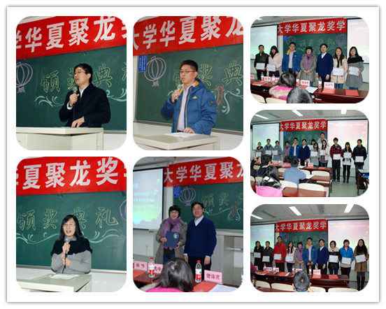 12月12日下午,2011—2012学年华夏聚龙奖学金颁奖典礼暨第二届华夏聚龙奖学金颁奖典礼在沙河校区公司楼6号楼106教室举行。北京华夏聚龙自动化设备有限公司企划部总经理柴伟先生、综合管理部总经理刘寅君女士、雷雅涵女士,金融公司党总支副书记李德峰副教授以及员工工作办公室赵彦华老师、谢海燕老师出席颁奖典礼,25名在校的获奖员工和120余名员工代表参加了颁奖典礼。颁奖典礼由员工工作办公室主任王志梅主持。