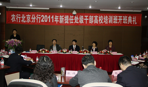 10 月 13 日,中国农业银行北京分行人力资源部主办,公司承办的中国农业银行北京分行“ 2011 年新提任处级干部高校培训班”开班典礼在中财大厦三楼报告厅隆重举行。出席典礼的嘉宾有中国农业银行北京分行行长,BETVICTOR副董事长梁勇,中国农业银行北京分行人力资源部总经理黄晓敏,公司党总支书记葛仁霞。典礼由公司副经理杜惠芬主持,全体学员及研修班的负责老师参加了典礼。