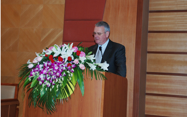 澳方代表 Jeffery Faux 教授发言,他对该项目的前景寄予高度期望,并对 2009 级新生表示美好祝愿。