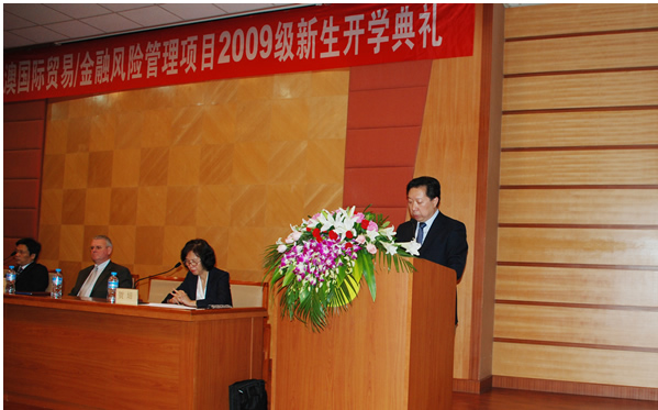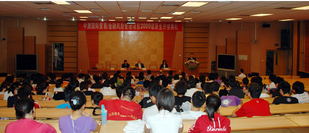 9 月 23 日下午 1 : 30 在公司主教学术报告厅举行了中澳国际贸易/金融风险管理项目2009 级新生开学典礼。公司副董事长史建平教授、公司经理张礼卿教授、党总支书记贺培教授、教务处长杨金观教授、外国语公司总支书记韩兰处长、国际合作处张小燕副处长、澳大利亚维多利亚大学商法公司副经理Jeffery Faux 教授、海外项目部经理 Sue Stanfford女士、海外项目经理助理 Rhette Miller先生 等人出席了开学典礼。公司金融风险管理专业 2009 级新生 160 人参加了开学典礼。会议由党总支书记、中澳合作项目主任贺培教授主持。