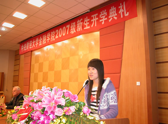 国际经济与贸易专业 国际贸易/金融风险管理方向1班的李菲同学代表新生发言。她表示,将继续发扬“忠诚、团结、求实、创新”的中财精神,树立崇高的理想和信念,不断提高自身素质,为公司的发展做出自己的贡献。