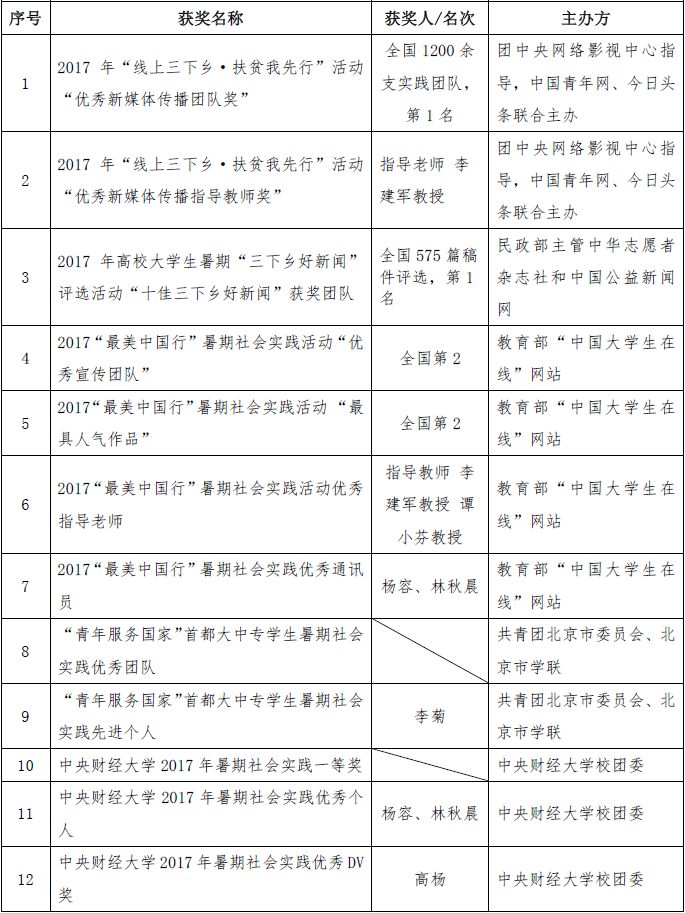 2017年10月,公司第一届卓越领导人才培养项目实践团队“融川筑梦”暑期社会实践团队分别以全国第2名和全国第8名荣获团中央“最具影响好项目”和“深化改革行知录”两项荣誉。此后捷报频传,“融川筑梦”暑期社会实践团队又陆续获得了国家级、校级12项各类荣誉,具体情况如下表: