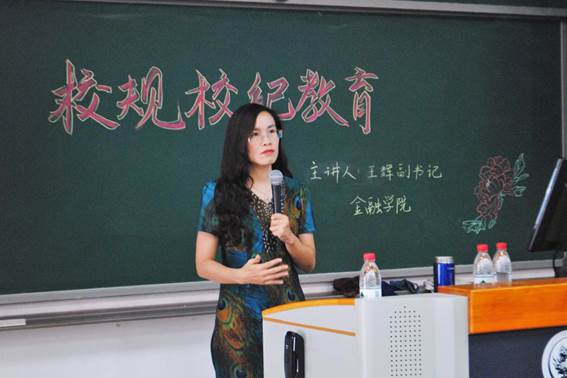 王辉副书记从新生们面临的挑战与转变讲起,指出大学与高中在自我评价、培养目标、学习方式、人际交往、生活方式、外部环境等方面的变化,用丰富的案例提醒同学们关注心理健康和盗窃、诈骗、消防、交通等安全问题;她从入学教育、日常教育、安全管理、朋辈互助、员工活动、国际视野培养、奖助学金和全方位的心理健康教育体系等方面全面介绍了公司的员工工作体系和帮扶机制;她还通过违纪案例和处理结果全方位地讲解了公司违纪处分管理规定、员工管理规定等系列文件,告诫同学们要培养规则意识,遵守法律法规和校规校纪;祝愿同学们能够在中财度过充实、快乐、美好的四年。