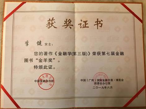 本年度,李健教授主编的《金融学》(第三版)荣获第七届中国金融图书“金羊奖”。陈颖教授主编的《商业银行经营管理》和《金融学》,马丽娟教授主编的《信托与融资租赁(第四版)》,贾玉革教授主编的《金融理论与实务》,杜惠芬教授和王汀汀副教授编著的《公司理财(第三版)》正式出版。