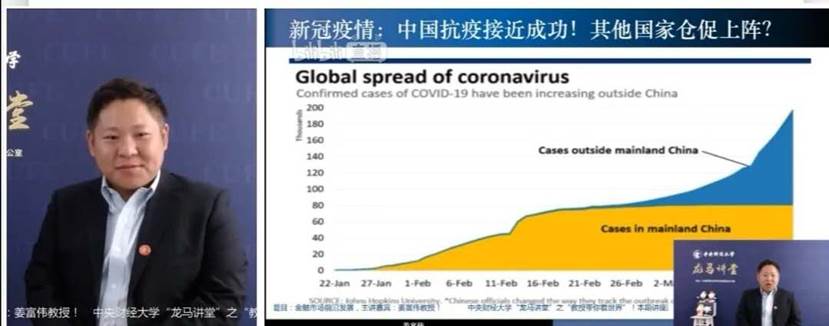 在“新冠疫情对金融市场和实体经济的影响”这个问题上,姜富伟教授首先从中国的抗疫情况入手,结合新冠病毒的传播情况,肯定了中国的管控手段对于防控病毒和恢复经济的高度有效性。他又从全国股市的角度分析了新冠病毒对于全球金融市场带来的冲击,从油价、失业率、公司盈利等角度分析这次疫情带来的经济影响。随之姜富伟教授表示了我们应有的乐观态度。姜富伟教授将这次疫情与二战带来的经济冲击相对比,指出经济具有自我修复能力,这次疫情带来的负面影响是短期的,短期影响带来的负面影响是很小的。在政府及央行采取的调控政策方面,姜富伟教授向我们讲述了我国所出台政策的积极性和稳健性,并说明我国的政策在扶持中小企业和扶持家庭方向上已经取得了显著成效。