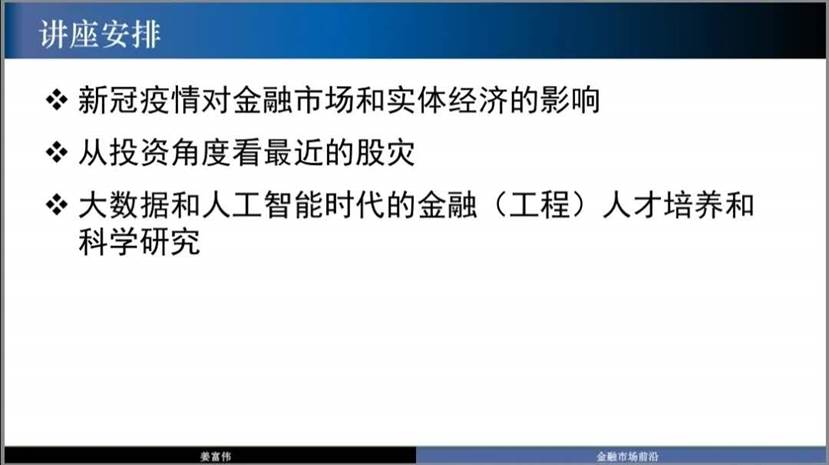 姜富伟教授从新冠疫情对金融市场和实体经济的影响、以投资角度看最近的股灾、大数据和人工智能时代的金融工程人才培养和科学研究三个方面进行了介绍与分析。