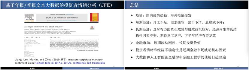 同时,金融学也是一个与时俱进的学科,在大数据和人工智能时代,金融学同样紧随时代脚步。姜富伟教授通过自己和员工研究课题的例子指出,如今的金融研究用到了多方面技术,包括定性的文本分析方法等。