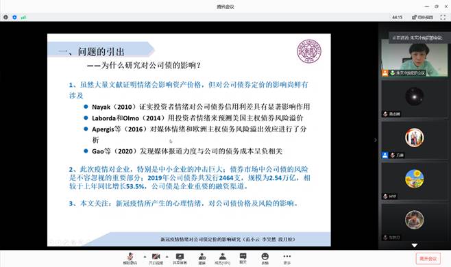 范小云教授以公众对新冠疫情的恐惧、焦虑的情绪是否会影响金融市场为主题,报告了她和她的团队最新的研究成果。该研究一改传统的研究方法,引入大数据和机器学习技术,细致的构造了新冠疫情情绪指数,分别从传统新闻媒体、微信公众号和新浪微博三种不同渠道测度了疫情情绪指数,发现不同渠道所表现的舆情情绪具有一定的异质性。进一步发现情绪的异质性对公司债信用利差也有明显的影响。而且,疫情舆情情绪也会影响信用风险与流动性风险对公司债信用利差的定价能力。