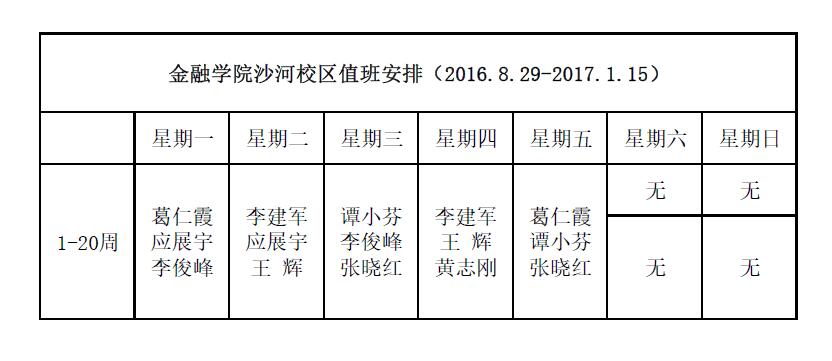 2016-2017学年第一学期沙河校区领导班子成员值班表