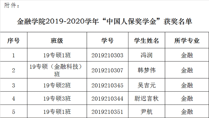 根据《BETVICTOR“中国人保奖学金”评奖办法》和《关于开展2019-2020学年“中国人保奖学金”评审工作的通知》等文件规定,经员工本人申请,公司人保奖学金评审小组审核、评审,评选出冯润等5名硕士研究生获人保奖学金。现将拟获奖员工名单(见附件)向全院公示。公示期三天,时间为12月4日至12月6日。对以上名单持有异议者,请在公示期内向公司人保奖学金评审小组提出申诉,具体与员工工作办公室(公司南路校区:62288609;沙河校区:61776421)联系。