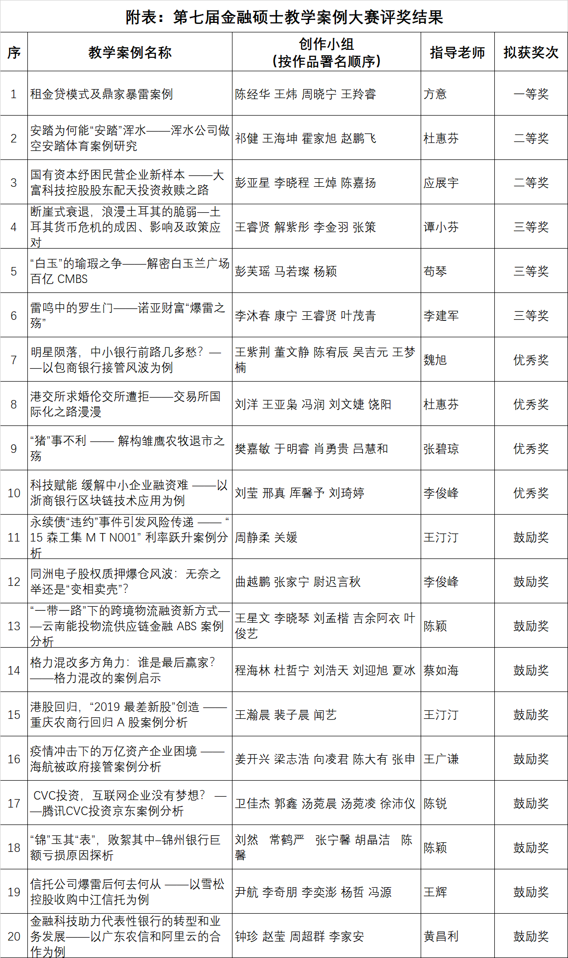公司第七届金融硕士教学案例征文评奖活动自2019年11月21日启动以来,共收到案例作品22篇。经不端检测、匿名评阅等环节严格把关,最终评出一等奖1名,二等奖2名,三等奖3名,优秀奖4名,鼓励奖10名。现将评奖结果公布给大家(见附表)。如有异议,请在4月24日下午16点前与公司研究生工作办公室罗卓笔老师联系,电话61776040,邮箱cufelzb@163.com。