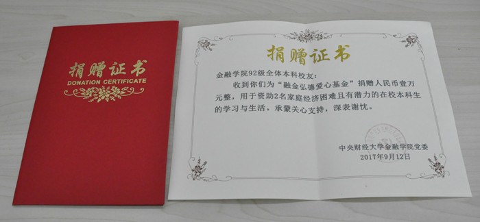 “融金弘德爱心基金”设立于2013年9月18日,是由公司党委发起主办的公益性基金。基金来自于院内教职工自愿捐助、公司员工和校外导师捐赠、社会企事业团体赞助、院内老师项目经费支持等,以援助员工应对突发事件、资助经济困难员工完成学业为主旨,帮助员工免除后顾之忧。该奖励基金先后为10余名家庭遭遇变故的学子提供30多万元资助,并评为“教育基金筹资项目设计大赛优秀项目”。92员工助学金是在“融金弘德爱心基金”框架下,由公司92级全体本科员工于2016年10月毕业二十周年聚会发起,每年9月由92级本科员工自发捐助,目前第二批助学金壹万元整已到位。
