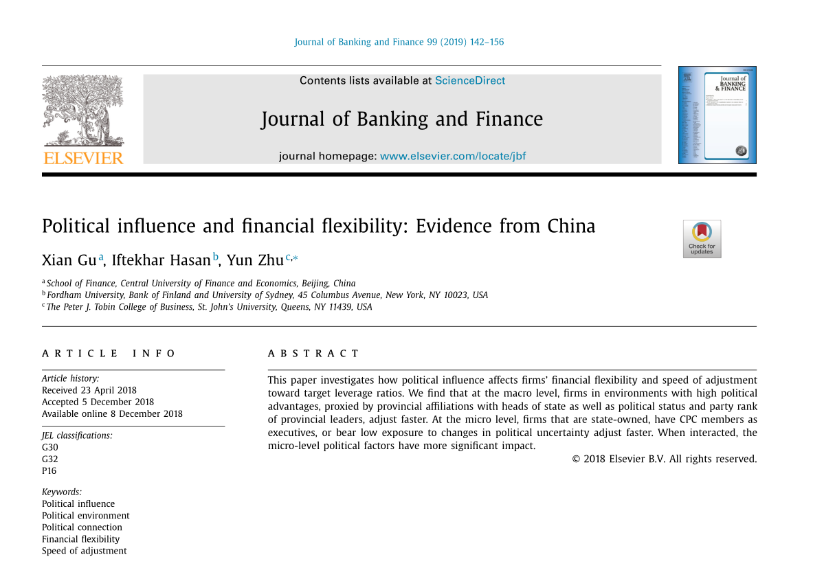 This paper investigates how political influence affects firms’ financial flexibility and speed of adjustment toward target leverage ratios. We find that at the macro level, firms in environments with high political advantages, proxied by provincial affiliations with heads of state as well as political status and party rank of provincial leaders, adjust faster. At the micro level, firms that are state-owned, have CPC members as executives, or bear low exposure to changes in political uncertainty adjust faster. When interacted, the micro-level political factors have more significant impact.