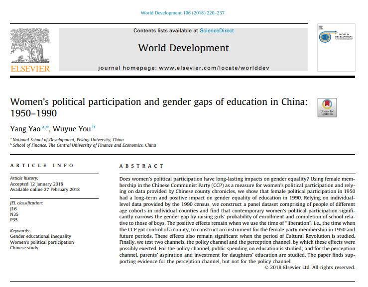 游五岳:Women’s political participation and gender gaps of education in China: 1950–1990