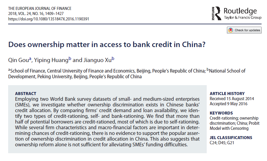 Employing two World Bank survey datasets of small- and medium-sized enterprises(SMEs), we investigate whether ownership discrimination exists in Chinese banks’credit allocation. By comparing firms’ credit demand and loan availability, we identifytwo types of credit-rationing, self- and bank-rationing. We find that more thanhalf of potential borrowers are credit-rationed, most of which is due to self-rationing.While several firm characteristics and macro-financial factors are important in determiningchances of credit-rationing, there is no evidence to support the popular assertionof ownership discrimination in credit allocation in China. This also suggests thatownership reform alone is not sufficient for alleviating SMEs’ funding difficulties.