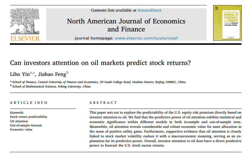This paper sets out to explore the predictability of the U.S. equity risk premium directly based oninvestor attention to oil. Wefind that the predictive power of oil attention exhibits statistical andeconomic significance within different models in both in-sample and out-of-sample tests.Meanwhile, oil attention reveals considerable and robust economic value for asset allocation inthe sense of positive utility gains. Furthermore, supportive evidence that oil attention is closelylinked to stock market volatility endues it with a macroeconomic meaning, serving as an explanation for its predictive power. Overall, investor attention to oil does have a direct predictivepower to forecast the U.S. stock excess returns.