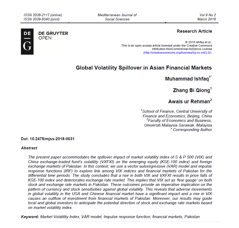 The present paper accommodates the spillover impact of market volatility index of S & P 500 (VIX) and China exchange-traded fund’s volatility (VXFXI) on the emerging equity (KSE-100 index) and foreign exchange markets of Pakistan. In this context, we use a vector autoregressive (VAR) model and impulse response functions (IRF) to explore link among VIX indices and financial markets of Pakistan for the differential time periods. The study concludes that a rise in both VIX and VXFXI results in price falls of KSE-100 index and deteriorates exchange rate market. This implies that VIX act as ‘fear gauge’ on both stock and exchange rate markets in Pakistan. These outcomes provide an imperative implication on the pattern of currency and stock sensitivities against global volatility. This reveals that adverse movements in global volatility in the USA and Chinese financial market have a significant impact and a rise in VIX causes an outflow of investment from financial markets of Pakistan. Moreover, our results may guide local and global investors to anticipate the potential direction of stock and exchange rate markets based on market volatility index.