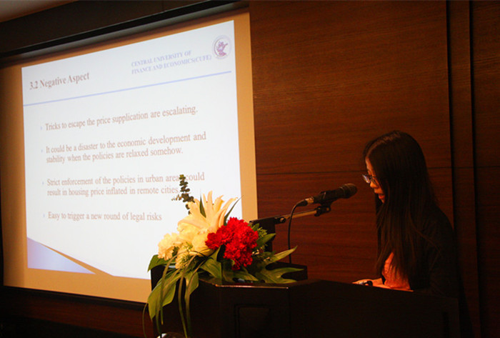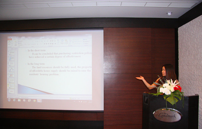 吴洁同学发表题为《THE ANALYSIS OF THE IMPACT OF PURCHASING RESTRICTION POLICIES ON COMMODITY HOUSING IN BEIJING》的精彩演讲,就自颁布以来一直饱受争议的中国“限购令”政策进行了深入探讨,对北京市的房地产现状进行分析,并根据现有数据及原理分析房地产限购令是否起到预期的调整房价的效果,就该项政策能否有效打击投机性购房需求进而稳定房价给出了自己的观点。演讲结束后,吴洁同学解答了现场嘉宾提出的有关“限购令”的一些问题,受到参会学者的好评。