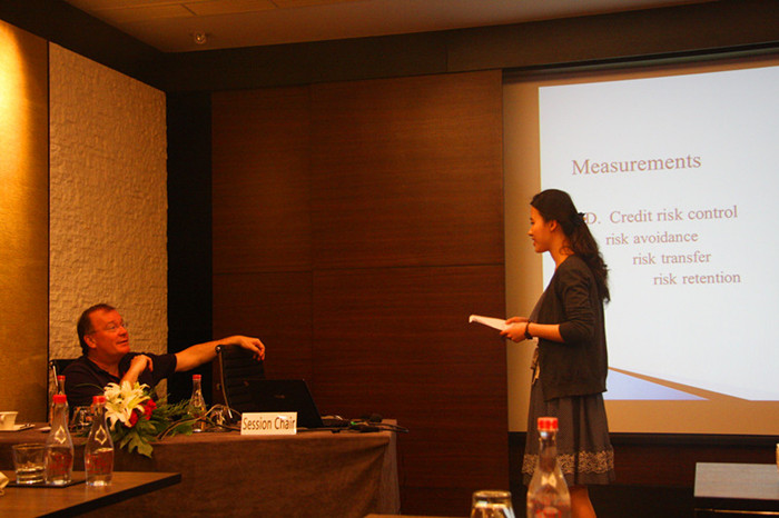 强文芸同学发表题为《THE ANALYSIS OF CREDIT RISK MANAGEMENT OF SUPPLY-CHAIN FINANCE IN CHINA》的精彩演讲。她首先介绍了供应链金融产生的背景,之后从目前中国供应链金融的发展现状引出了至关重要的信用风险管理问题,并对其进行了初步探索。她认为,在现阶段,除了要建立一整套信用评估体系以外,信息平台的建设,相应的法律法规的完善,以及逐步放开民营资本如第三方物流公司进入金融领域等等,对于我国供应链金融信用风险的管理以及整个供应链金融的可持续发展具有重要意义。强文芸同学的演讲引起热烈的反响,演讲结束后就供应链金融相关问题与与会嘉宾展开热烈的讨论,就大家提出的问题和疑惑一一做了解答。