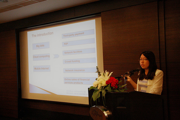 常鑫同学发表了题为《THE ANALYSIS OF THE IMPACT OF THE INTERNET FINANCE ON CHINA'S FINANCIAL STRUCTURE》的精彩演讲,分别从金融功能和金融机构的视角详细论述了互联网金融对中国金融结构的影响。她认为,目前互联网金融对传统金融行业更多的是一种有益的补充和延伸,会倒逼传统金融进行改革,发挥“鲶鱼效应”,这将有助于传统银行业的自我完善。但是互联网金融尚无法取代或撼动传统金融机构的地位,二者应加强合作,实现优势互补。演讲结束后,常鑫同学与现场的专家、学者进行了充分深入的讨论交流,就时下的热点问题与大家分享自己的观点和意见,就嘉宾提出的问题和疑惑进行了详细的解答。