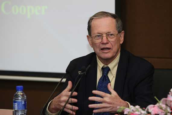 主题演讲开始后,Richard Cooper教授首先阐述了此次次贷危机和1931年的经济危机的三点不同:货币制度与金融监管的更加完善;政府应对危机更加积极而富有力度;经济、金融理论的快速发展。在谈到应对此次危机的措施时,Richard Cooper教授对各国中央政府和央行所采取的积极迅速的措施表示了赞赏,强调正是由于各国政府及监管机构的协调一致的行动,为最终化解次贷危机作出了贡献。对于次贷危机产生的原因,Richard Cooper教授则着重指出,过度的抵押资产证券化、长期的低利率政策和贷款条件的放松是此次危机潜伏的温床。