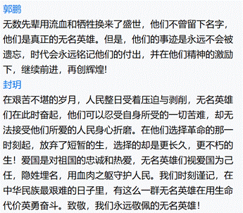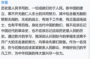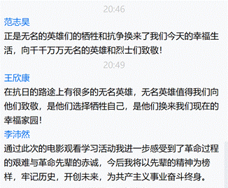 博士生第一党支部书记赵志桦同志认为:“战争年代,和平来之不易,是革命先烈用鲜血缔造了新中国,这里有许多英雄被人铭记,也有不少默默无闻的仁人志士,他们值得我们敬仰,他们的精神值得我们学习。值此中国共产党成立102周年之际,观看此片令人振奋,发人深省,作为青年党员,我希望自己可以传承到革命先烈不怕困难,敢于牺牲的高尚品格,厚植家国情怀,涵养进取品格,为共产主义远大理想而奋斗!”博士生第二党支部副书记毕燕璐同志向身处黑暗而心向光明的无名英雄们致敬:“无名者,是千千万万忠贞不屈的无名英雄。革命前辈敢于斗争、不怕牺牲,共同写就可歌可泣的抗日史歌。硝烟已散,精神永存!”博士生第二党支部积极分子赵国君同志分享说:“地下工作者们,没有姓名,抛弃自我,投身到一场一场的伪装中,坚守心中的信仰,为理想献身。他们的名字无人知晓,但他们的功勋永垂不朽。”许多同志也发表了自己的看法,分享学习感悟。