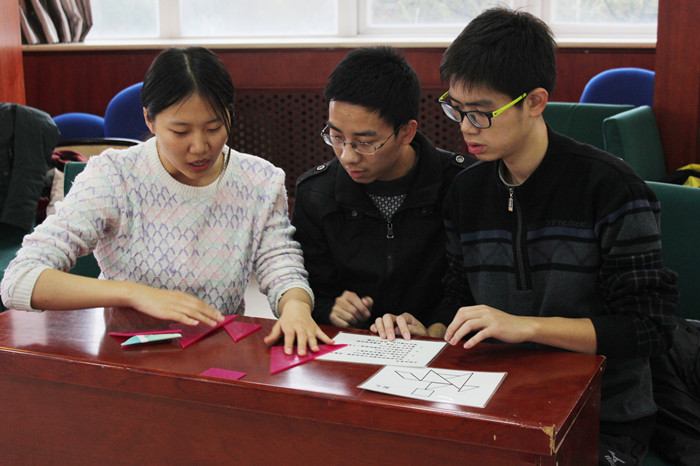 之后,队员们在教练的带领下,完成了“达芬奇密码”和“团队七巧板”这两个项目。在“达芬奇密码”的项目里,队员们学到了如何充分利用已有资源,分工合作,提高效率;在“七巧板”项目中,队员们了解到领导者的重要作用以及如何进行团队协调。 在“七巧板”项目总结时,一位同学利用经济学的知识将其解释为政府调节市场资源的分配,其精彩的总结赢得了全场的热烈掌声。