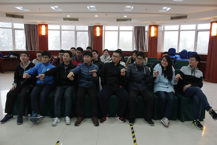 因天气原因,本次素质拓展培训安排在室内进行。素质拓展教练通过简单的热身和破冰活动传递了素质拓展培训的意义,随后,在教练的指导下,老师和同学们很快分为两队,各自设计了队伍的队名,口号,队旗并选出了队长、安全员、旗手和队蜜。其中,红队名为“亮剑队”,为“亮剑在手,谁与争锋”之意;绿队名为“一路向前队”,为“生命不息,战斗不止”之意,之后两队都进行了各具特色的团队展示。